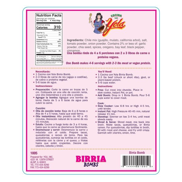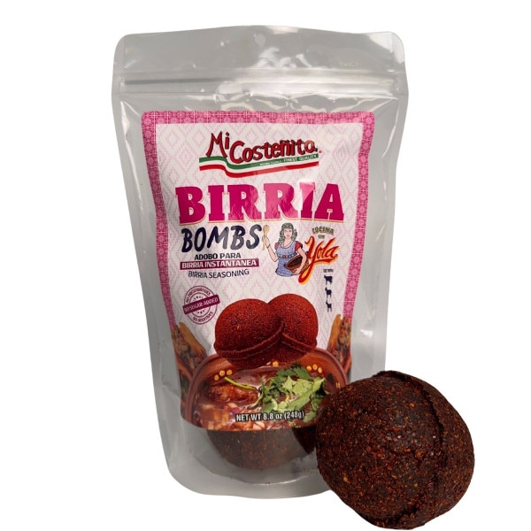Birria Bombs by Mi Costeñita make authentic Mexican birria tacos effortless in a convenient 2-pack (4.4 oz each). Our dehydrated bombs blend ground guajillo, Caliornia and mulato chiles, tomato powder, garlic, onion, oregano, cumin, cinnamon, and cloves with a chia seed gel binder for rich, savory flavor. Just add to 3-4 lbs of meat or plant-based protein and water—simmer for tender birria. Crafted in small batches in Alsip, IL, reflecting our Mexican heritage. Vegan, gluten-free, and ready for tacos, ramen, or quesabirria. Shelf-stable for 12 months.